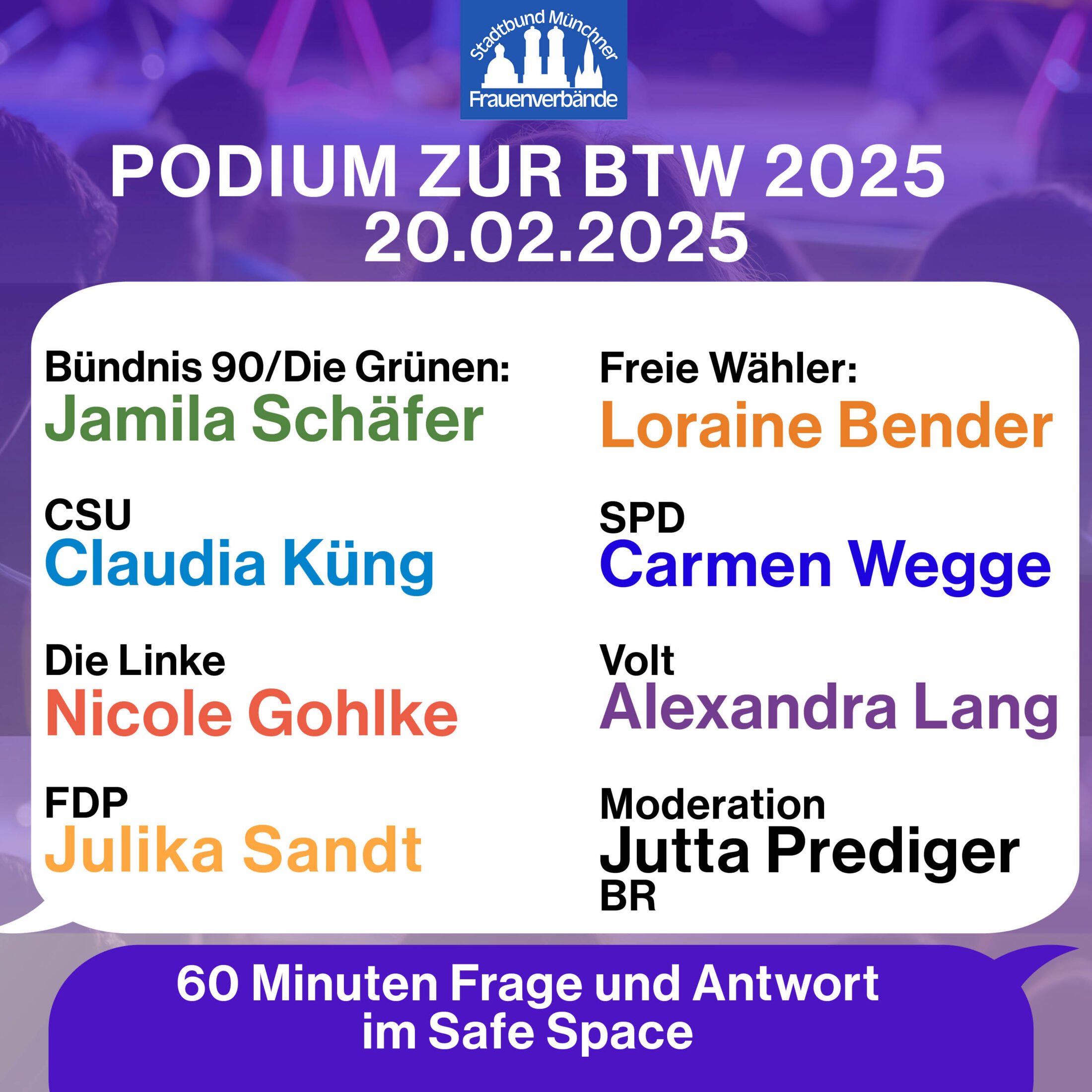 Liebe Frauenverbände, liebe Frauennetzwerke und Unterstützer*innen des Stadtbundes, am 20. Februar 2025 war es endlich so weit: Der Stadtbund Münchner Frauenverbände lud herzlich zu seiner Podiumsdiskussion zur Bundestagswahl 2025 ein. Sieben Politiker*innen verschiedener Parteien standen in einer 60-minütigen Gesprächsrunde Rede und Antwort – offen, direkt und in einem geschützten Raum, gestaltet von Frauen für Frauen.**
