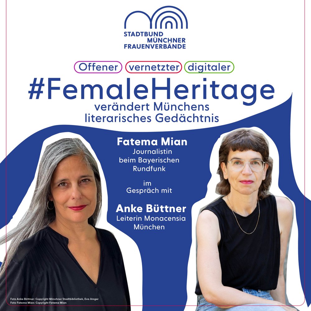 Wie #FemaleHeritage das literarische Gedächtnis Münchens erweitert und welche neuen Wege die Monacensia dabei als Institution einschlägt, schildert Anke Buettner, Leiterin der Monacensia, in ihrem Impulsvortrag #FemaleHeritage verändert Münchens literarisches Gedächtnis. Die BR Journalistin Fatema Mian spricht im Anschluss mit Anke Büttner über #FemaleHeritage, Veränderung von Organisationen, was wir vom Alten bewahren und mit Neuem verbinden. Fragen aus dem Publikum sind willkommen.
