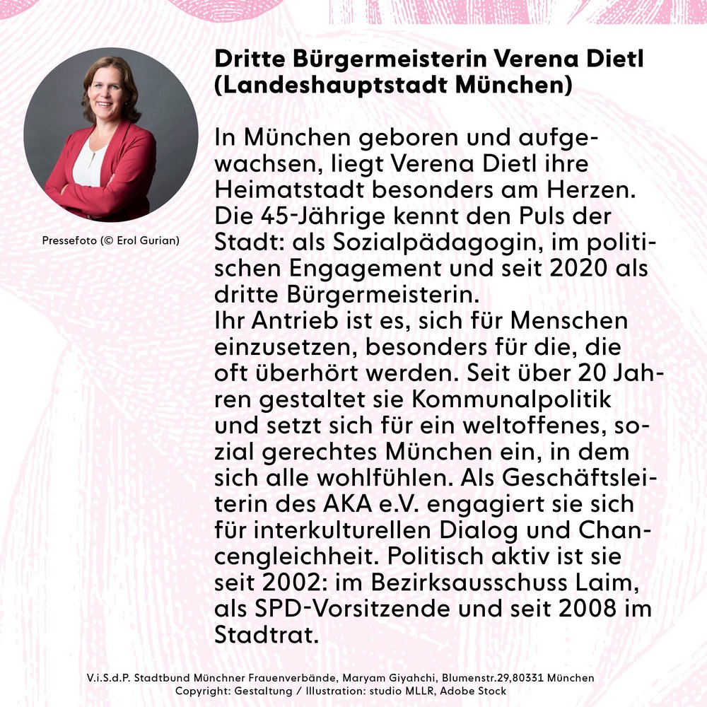 Verena Dietl ist seit 2020 dritte Bürgermeisterin der Landeshauptstadt München und kennt als erfahrene Politikerin die Herausforderungen großer Kommunen. Ihr Ziel ist es, den Alltag der Menschen zu verbessern, für die einzustehen, die oft überhört werden und ein weltoffenes und tolerantes München zu schaffen.