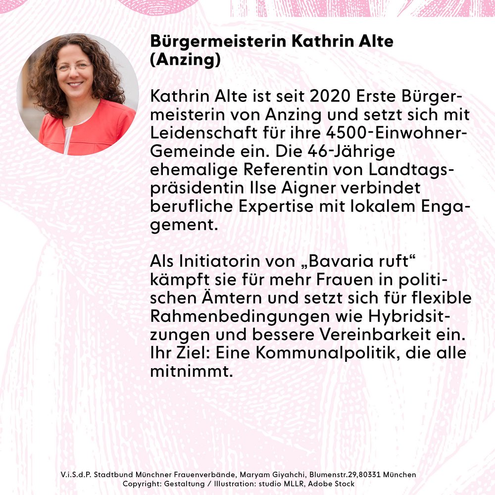 Kathrin Alte ist Bürgermeisterin der Gemeinde Anzing und verfügt über langjährige Erfahrung in kommunalen Gremien. Sie setzt sich mit der Initiative „Bavaria ruft“ für eine Stärkung von Frauen in der Kommunalpolitik ein.