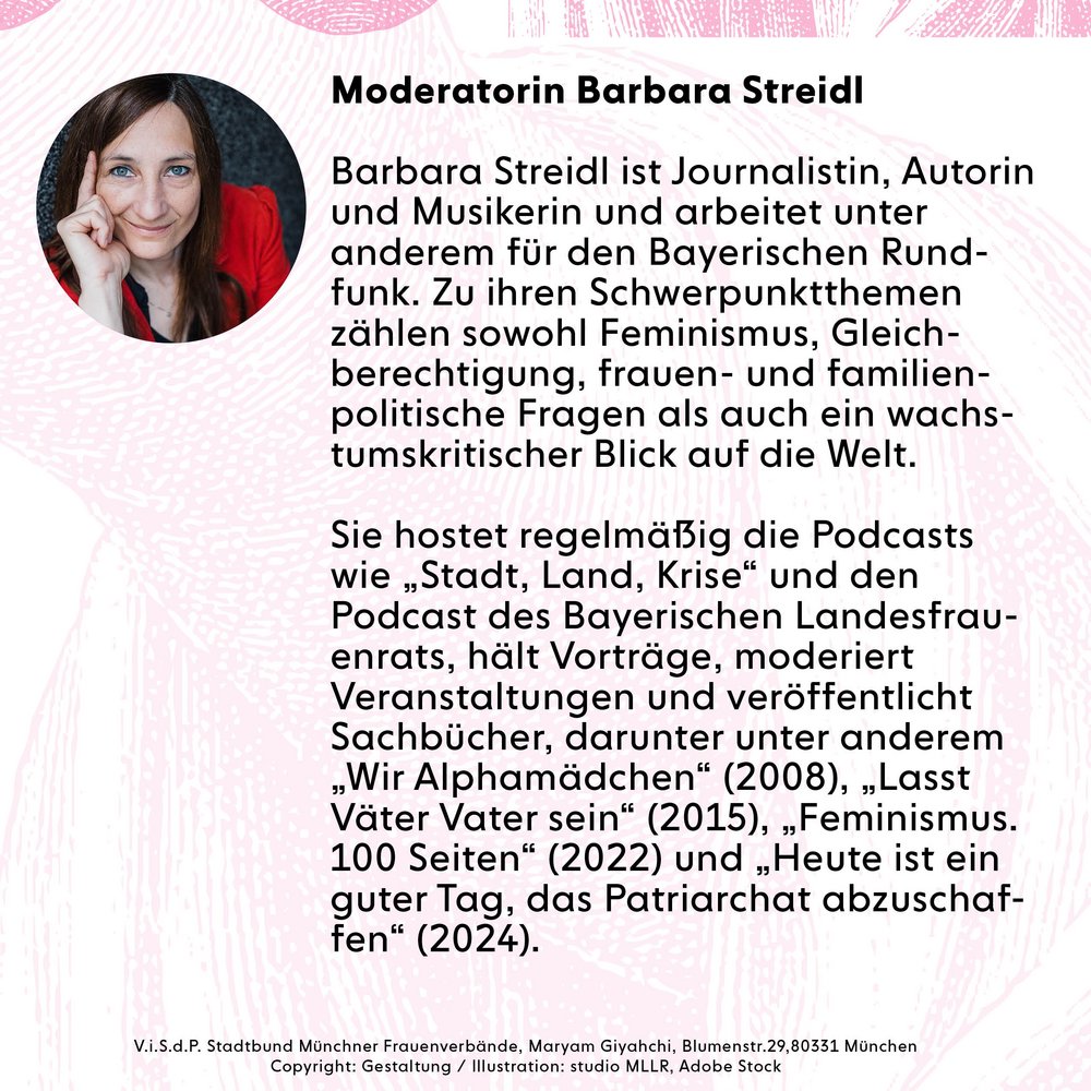 Barbara Streidl ist Journalistin, Autorin und Musikerin. Sie ist beim Bayerischen Rundfunk tätig, moderiert Diskussionsrunden und schreibt zu feministischen und gesellschaftspolitischen Themen. Als Co-Host des Podcasts „Stadt, Land, Krise“ und durch ihr Engagement bei Frauenstudien München schafft sie Räume für kritische Debatten.